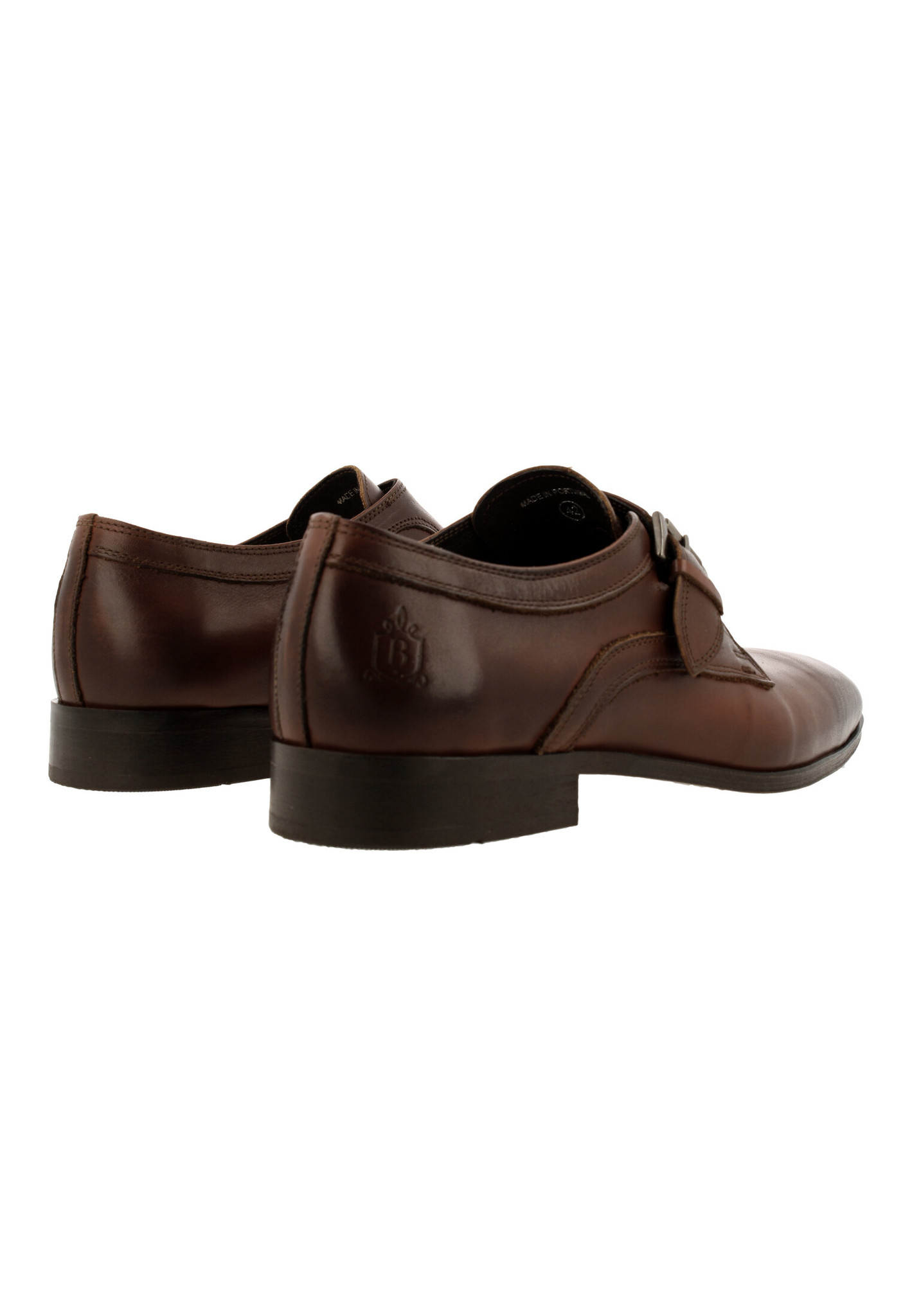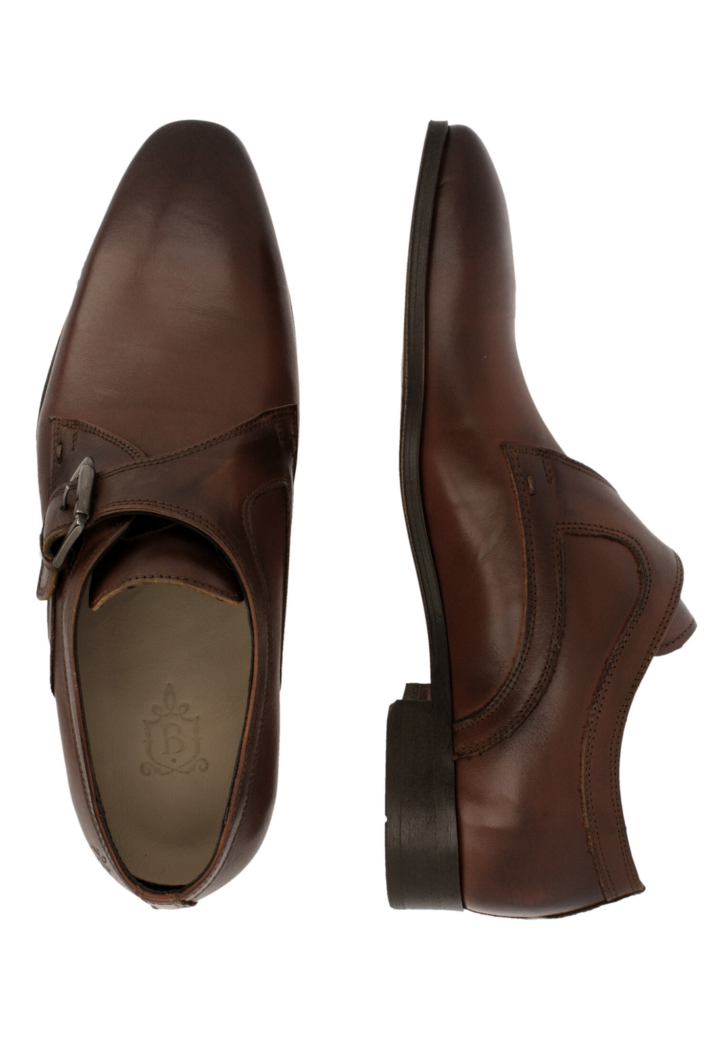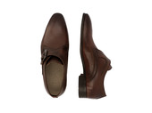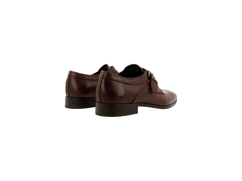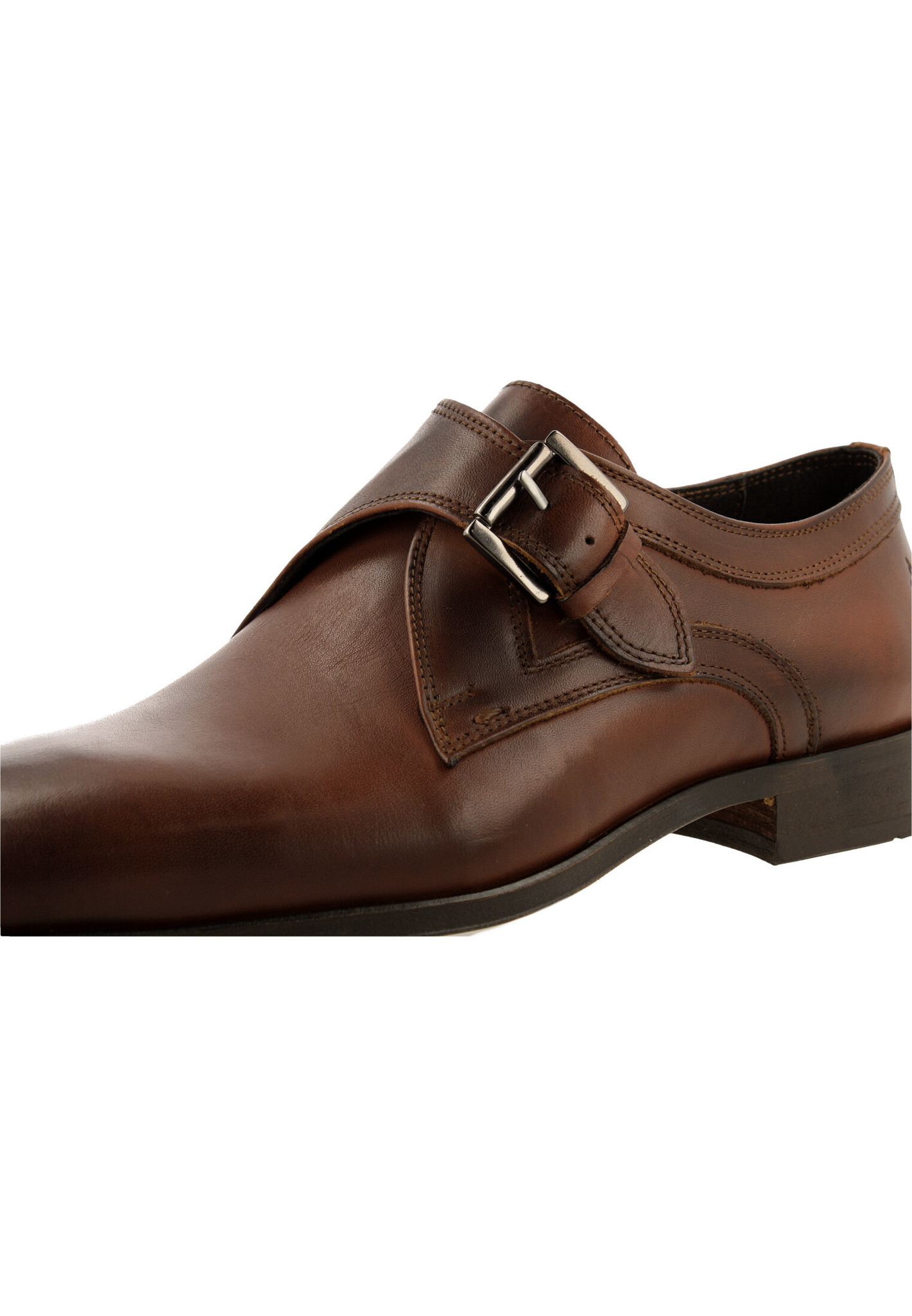 Handgefertigter Lederschnallenschuh für Herren. Dieser Schnallenschuh ist aus Leder gefertigt und hat eine glatte Karree-Kappe. Über den Spann verläuft ein Riemen mit einer einzelnen silbernen Schnalle. Dieser klassische Schnallenschuh ist komplett mit Leder gefüttert und hat ein herausnehmbares Fußbett. Die Laufsohle aus Leder ist durch Gummi verstärkt. Dieser Schnallenschuh hat eine Absatzhöhe von 2 cm.