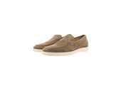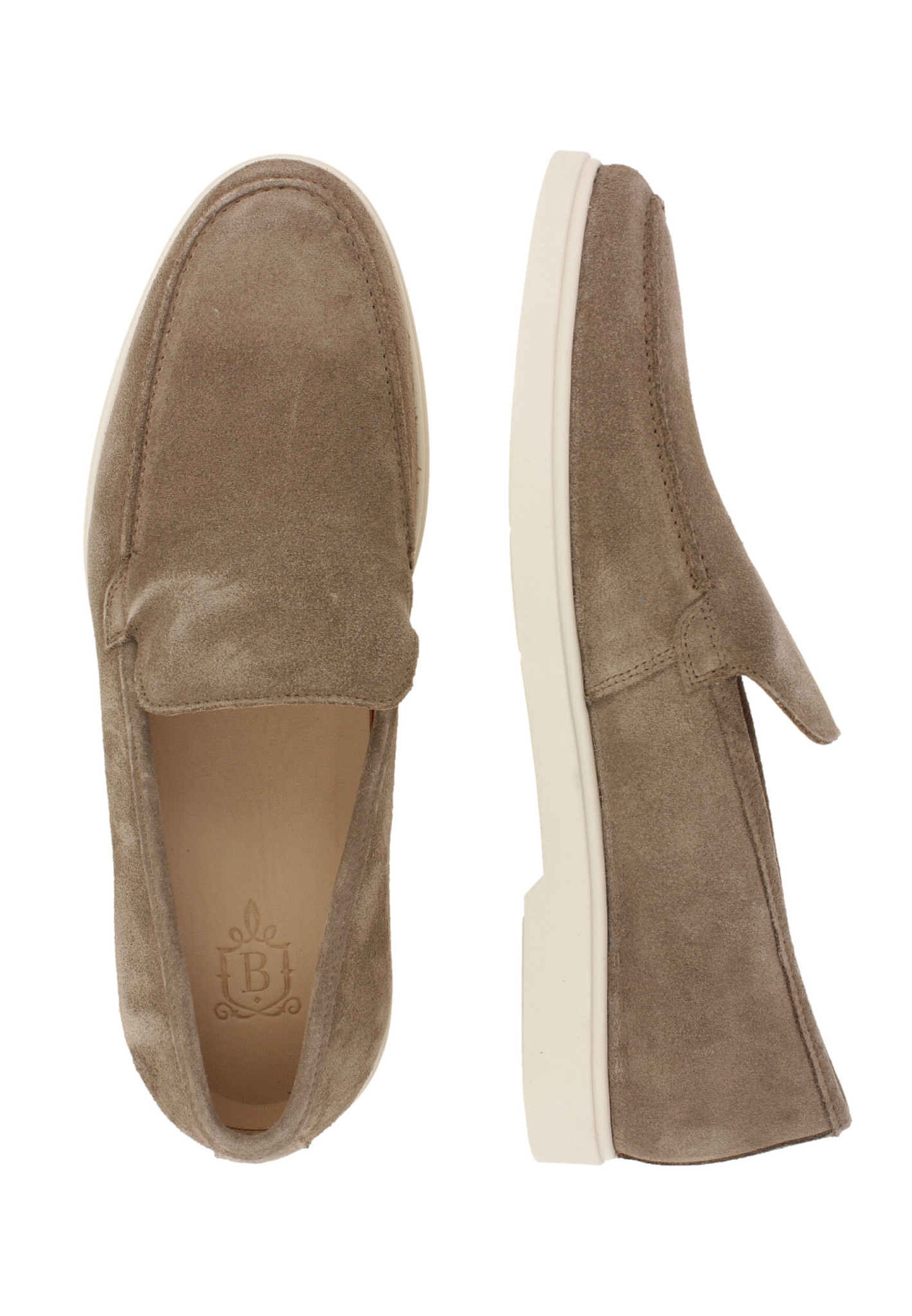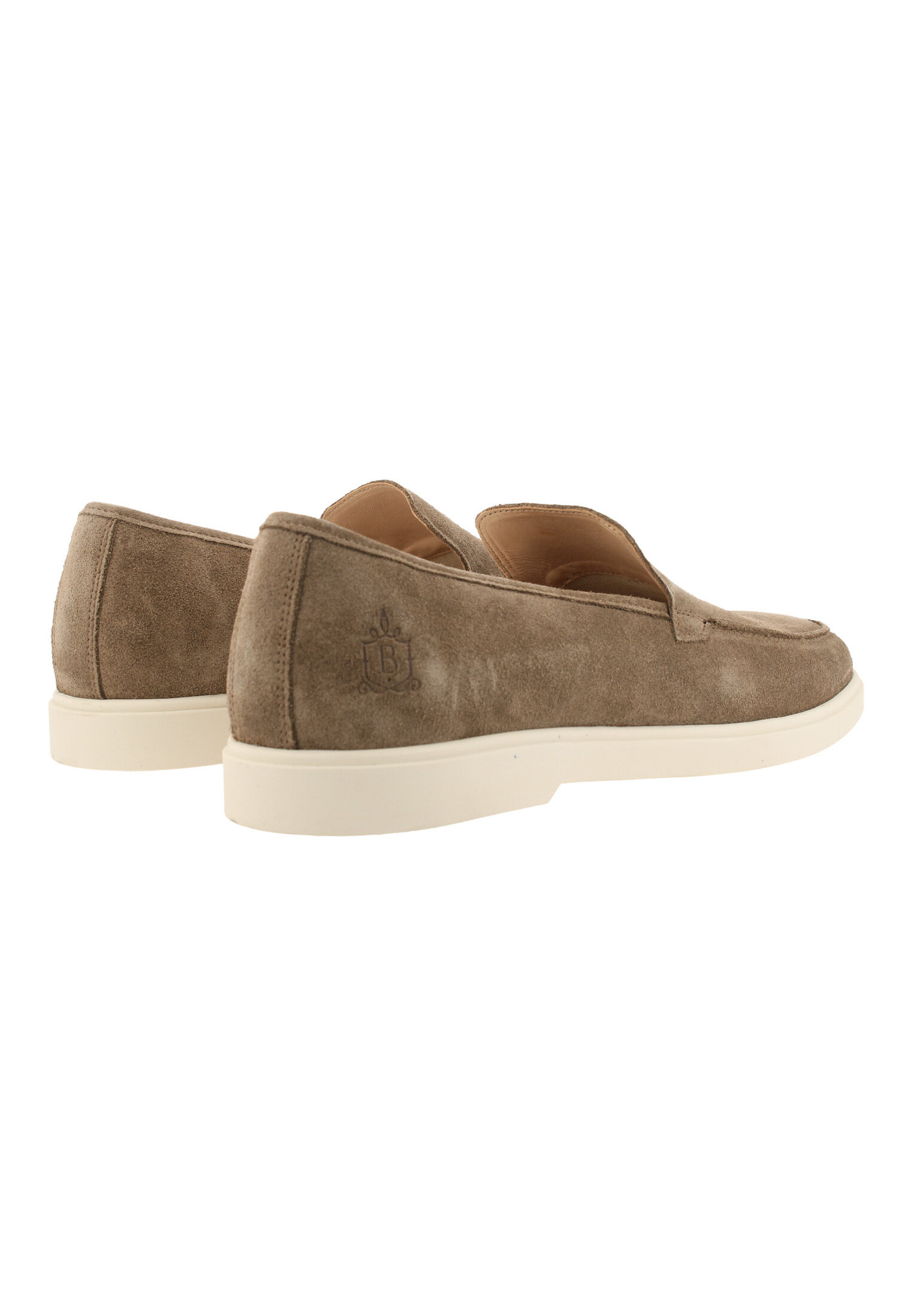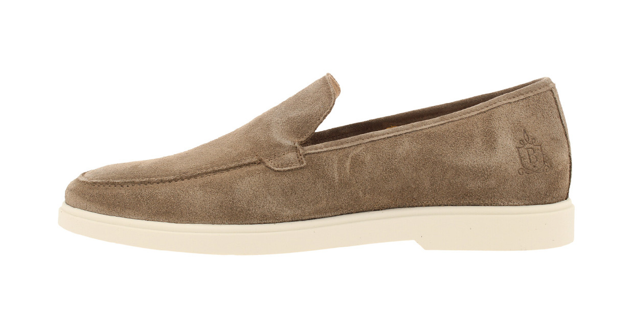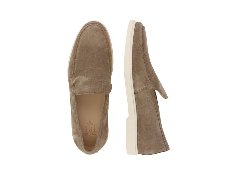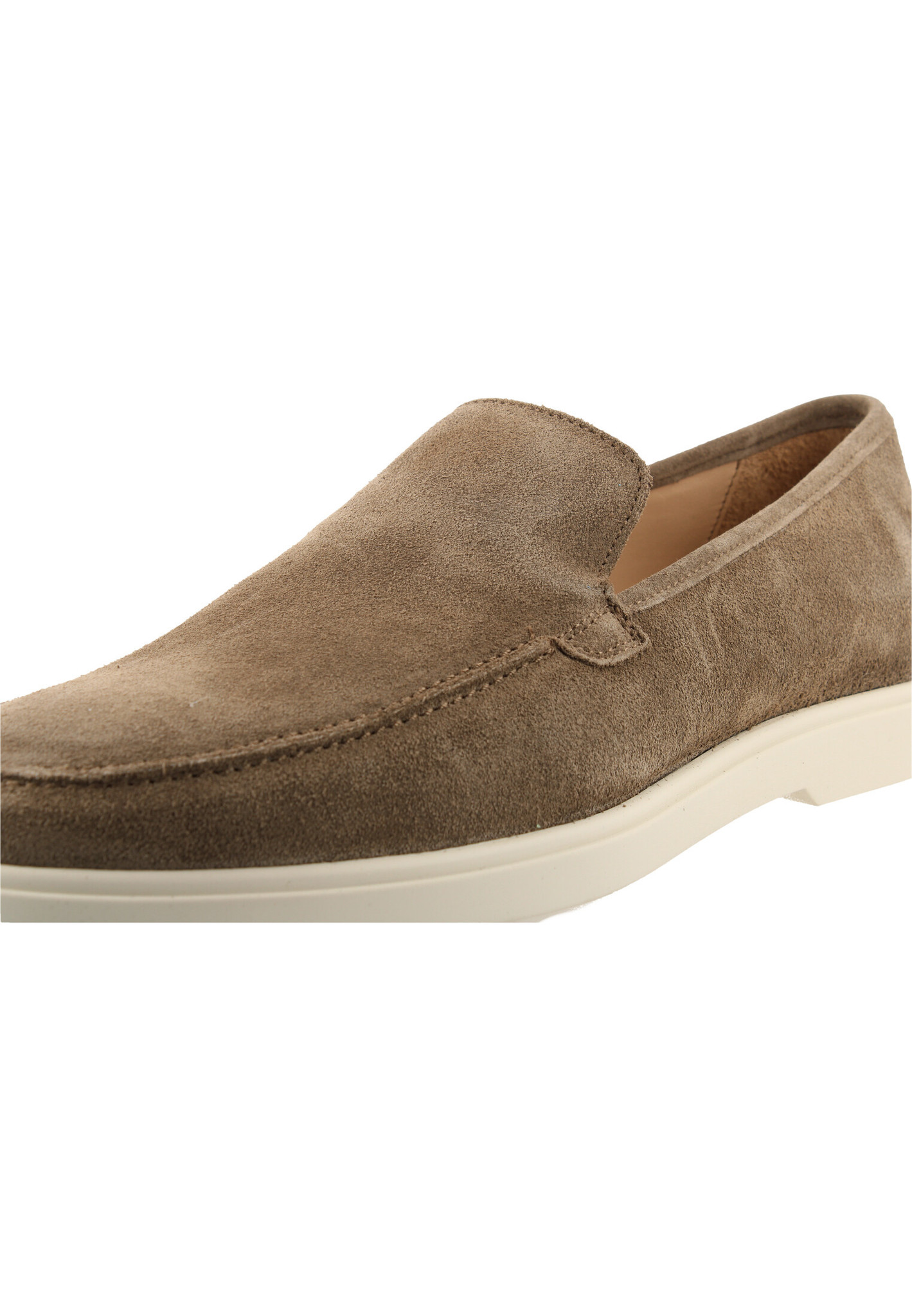 Handgefertigter Wildleder-Loafer mit Spiegelnaht und Gummisohle. Dieser Wildleder-Schlupfschuh ist mit Leder gefüttert. Die weiße Gummisohle sorgt für einen sportlichen Look.