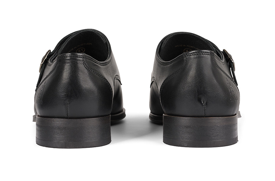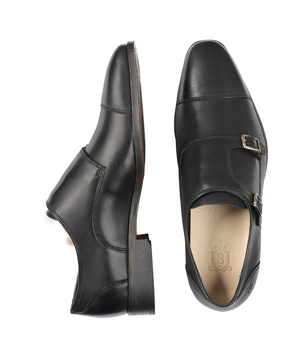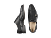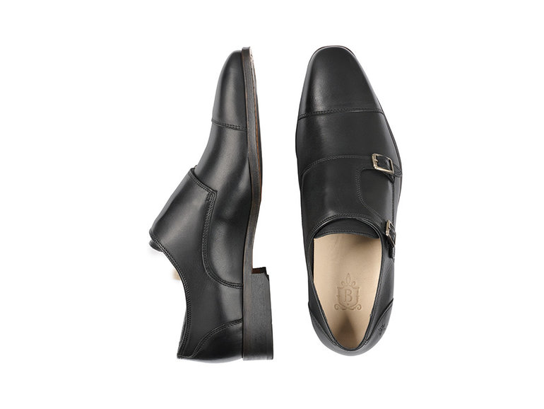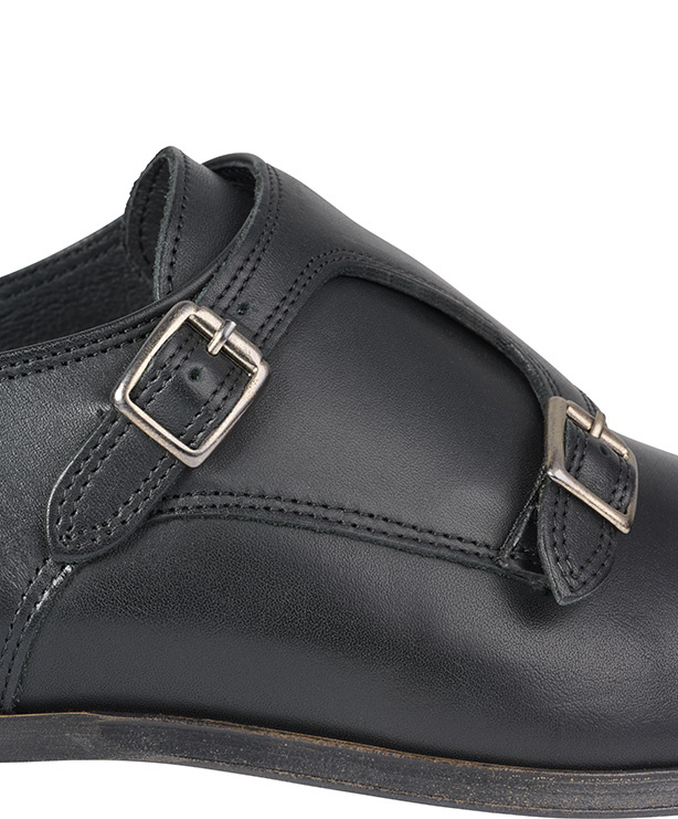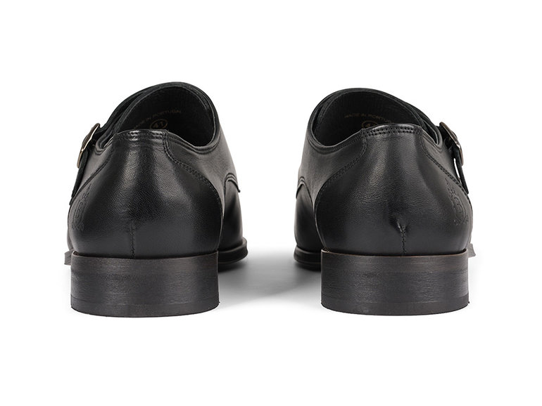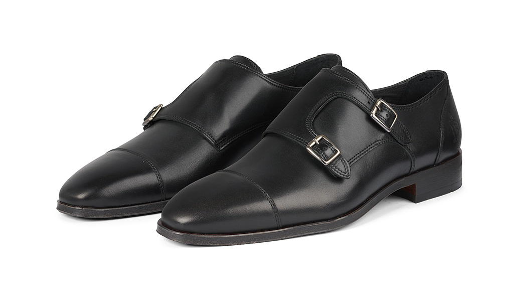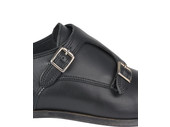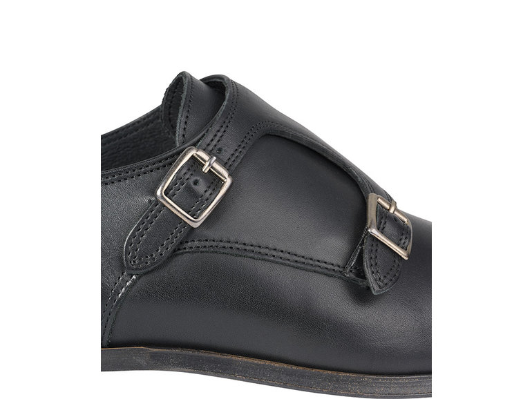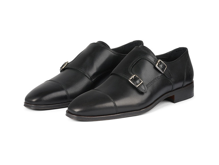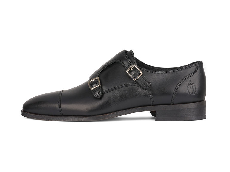 Deze gespschoen voor heren is uitgewerkt in zwart leer met een dubbele gespsluiting en een naad op de neus. Het model is voorzien van een klep over de wreef met zilverkleurige dubbele gespsluiting.