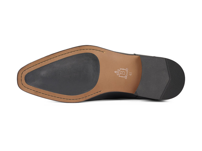Deze gespschoen voor heren is uitgewerkt in zwart leer met een dubbele gespsluiting en een naad op de neus. Het model is voorzien van een klep over de wreef met zilverkleurige dubbele gespsluiting. Verder is het binnenwerk volledig leer gevoerd en voorzien van een uitneembaar voetbed. De leren zool en hak zijn voorzien van praktische rubber loopvlakken, voor antislip eigenschappen en duurzaamheid.