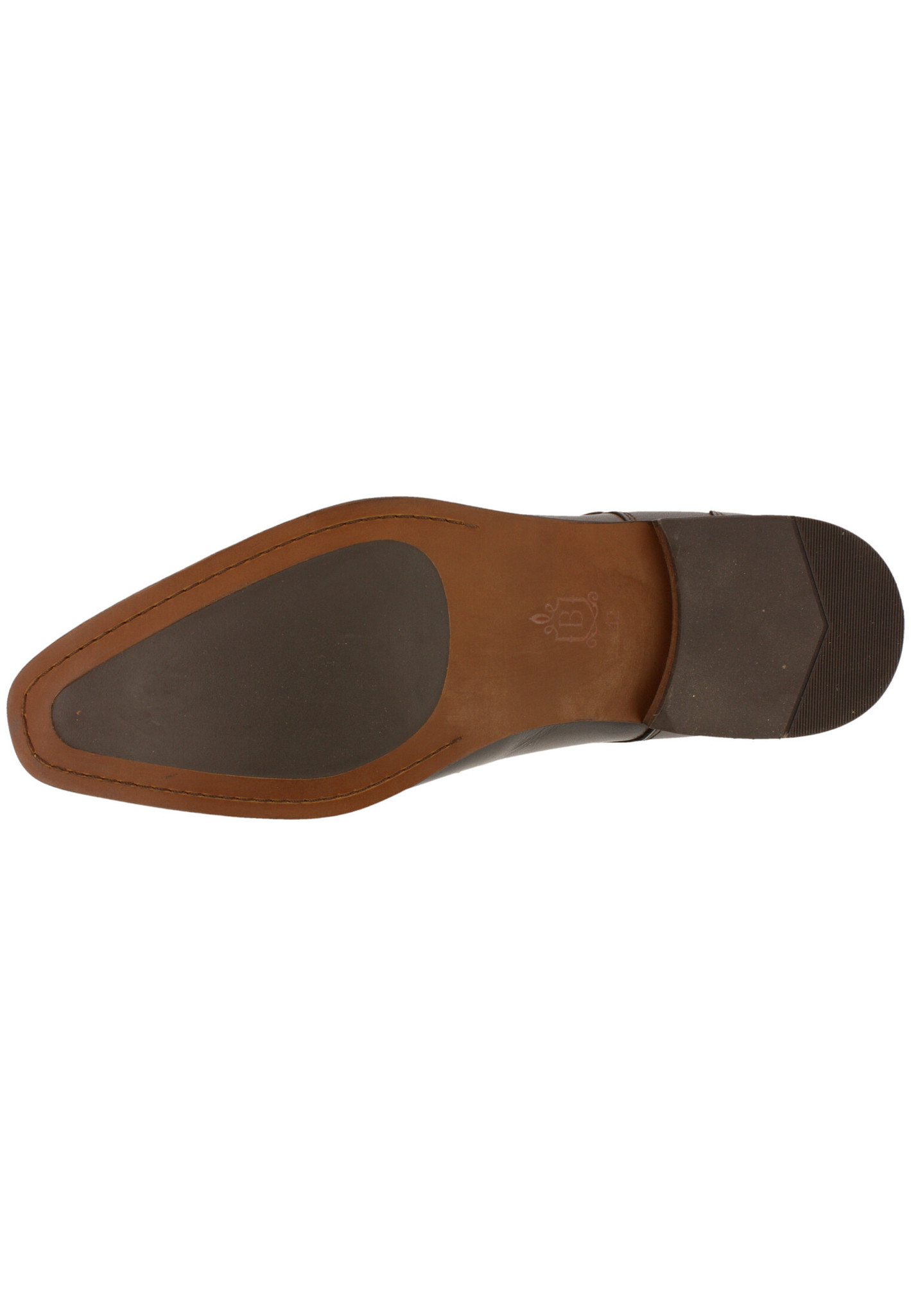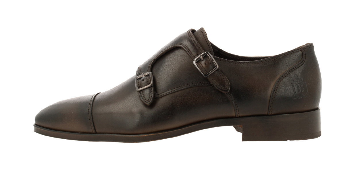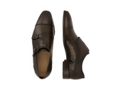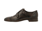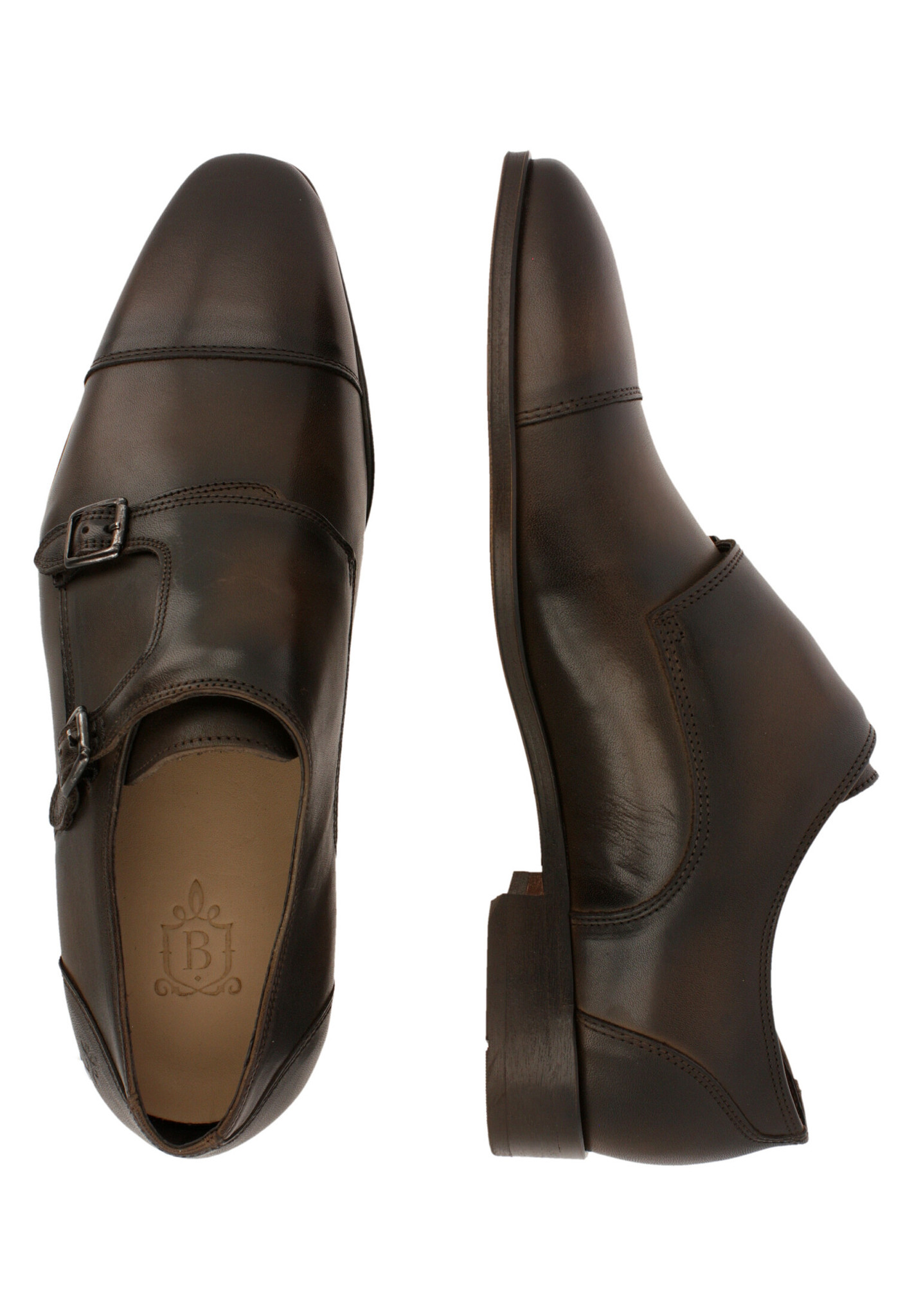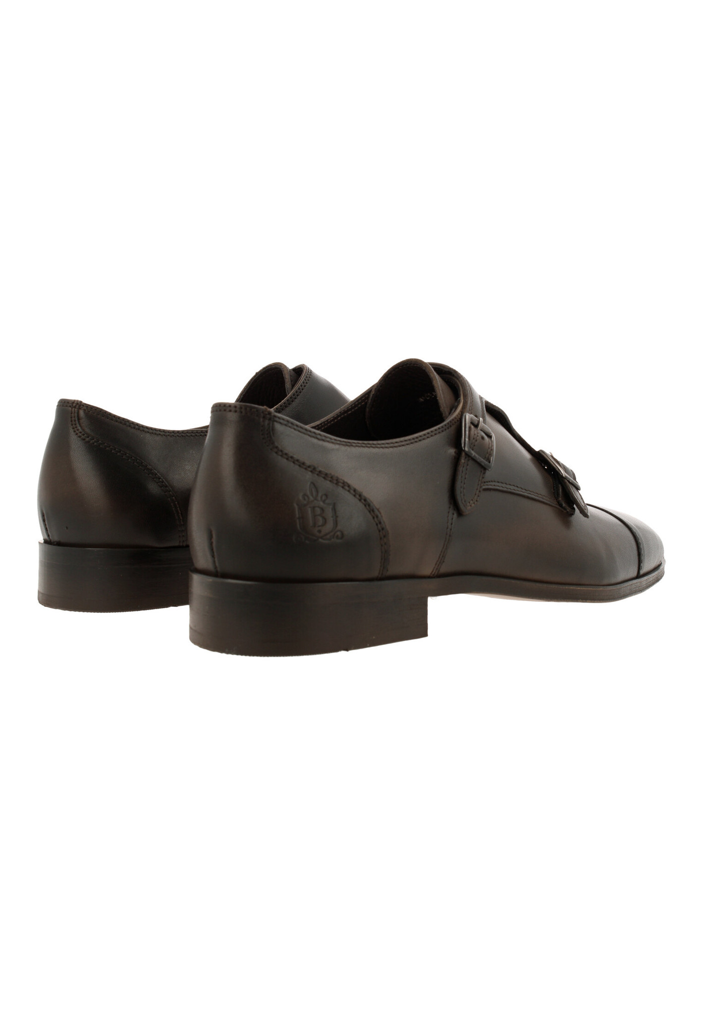 Deze gespschoen voor heren is uitgewerkt in donkerbruin leer met een dubbele gespsluiting en een naad op de neus. Het model is voorzien van een klep over de wreef met zilverkleurige dubbele gespsluiting.